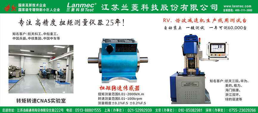 Jiangsu Lanmec Technology Co., Ltd.江蘇蘭菱科技股份有限公司成立于2002年,國家級高新技術企業、江蘇省扭矩傳感器研發中心、江蘇省企業研究生工作站。 公司主要產品: 轉矩轉速傳感器(扭矩傳感器):范圍0.01-2000KN.m,可以定制防爆、非標等;各類動力測試設備:電機測試臺、減速機測試臺、電動機測試臺、執行器測試臺、蝸輪箱測試臺、閥門扭矩測試臺、鉆機測試臺、液壓馬達測試臺等;各類模擬負載磁粉制動器、磁滯制動器、電渦流制動器、電力測功機等;測試儀表及軟件的研發與生產。 蘭菱科技通過了ISO9001、ISO14000、ISO45001體系認證,歐盟CE認證,擁有自營進出口權,強大的研發能力、全產業鏈的制造能力、及時售后的保障能力。